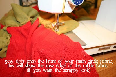 You can make the edge as ruffled as you want by how big of pieces you gather and fold. You can make it as different as you want by which way you fold your fabric (away from you, towards you). Have fun and be creative. Keep sewing your strips on until you get all the way around your circle.